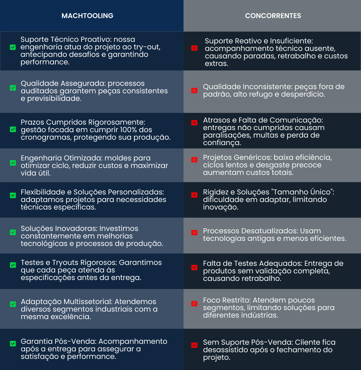 Na Machtooling, entendemos que cada projeto é único. Por isso, trabalhamos lado a lado com nossos clientes, oferecendo soluções personalizadas em moldes e usinagem, garantindo que suas demandas sejam atendidas com máxima precisão e no menor prazo possível.